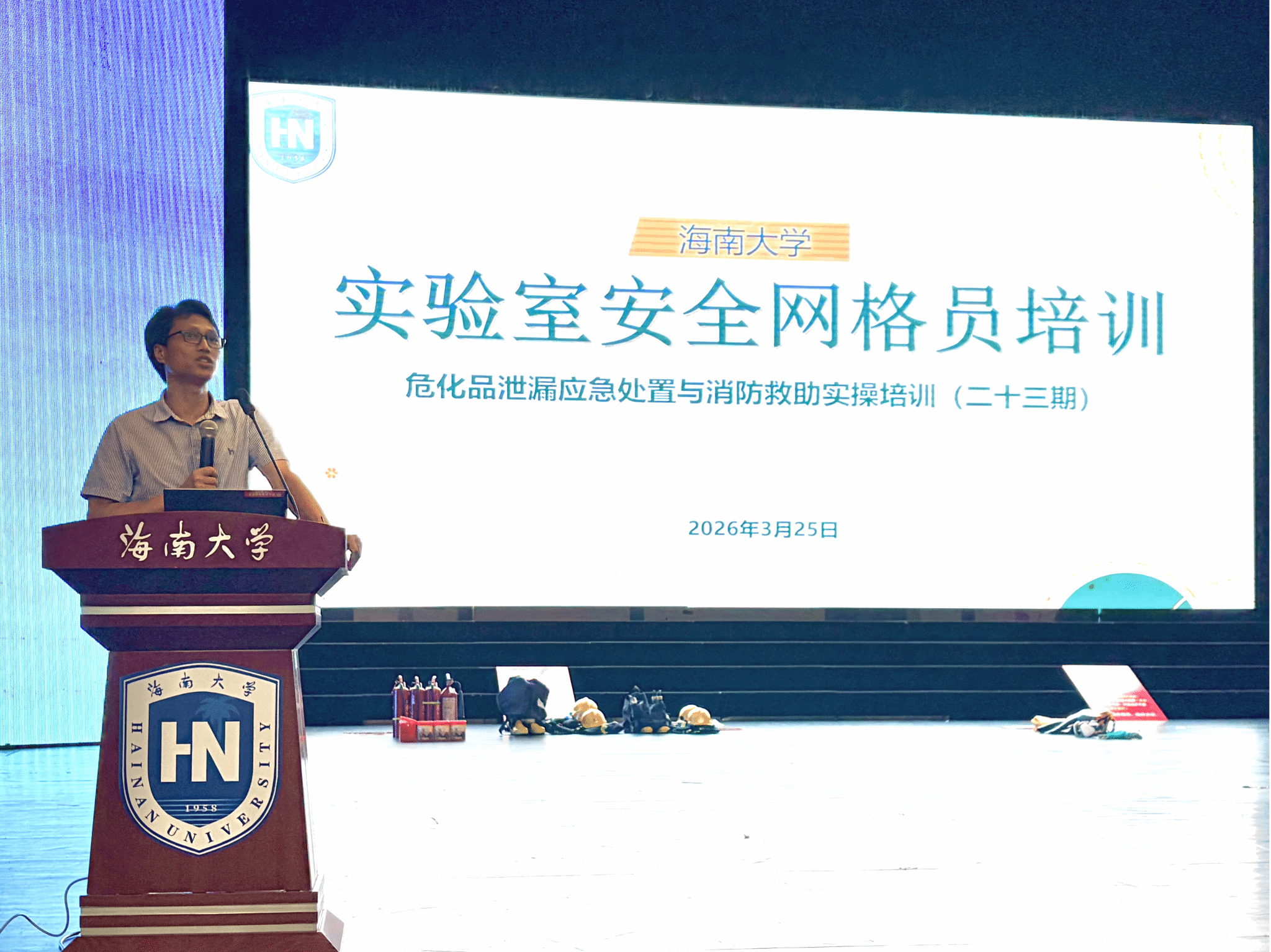 2026年3月25日下午,为强化实验室安全管理,增强师生安全意识和应急处置能力,充分发挥实验室安全网格员“神经末梢”作用,实验室与设备管理处联合保卫处在思源学堂组织了实验室安全网格员培训,并同步开展了第二十三期危险化学品泄漏应急处置及消防应急实操培训。本次培训共有600余名实验室安全管理人员及网格员参加,进一步巩固了校园实验室安全防线。